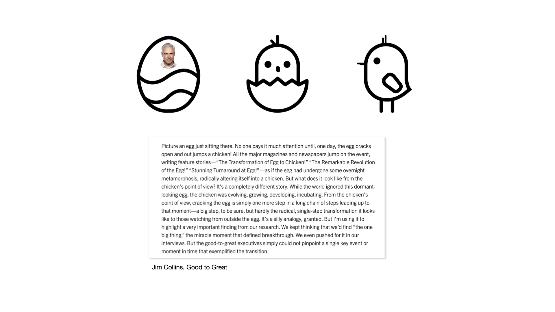 He explains the Flywheel effect through a simple story about an egg that hatches into a chicken. In this story of the egg, he talks about small changes that lead up to a big transformational change - basically the egg becoming a chicken is a transformational change. From the outside it looks sudden but from the inside we know that so much work and so many small changes lead to this big transformational change.