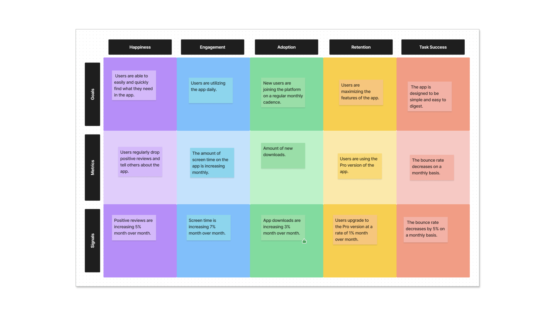 This is an example of the Figjam team using the HEART framework to identify key opportunities for growth.